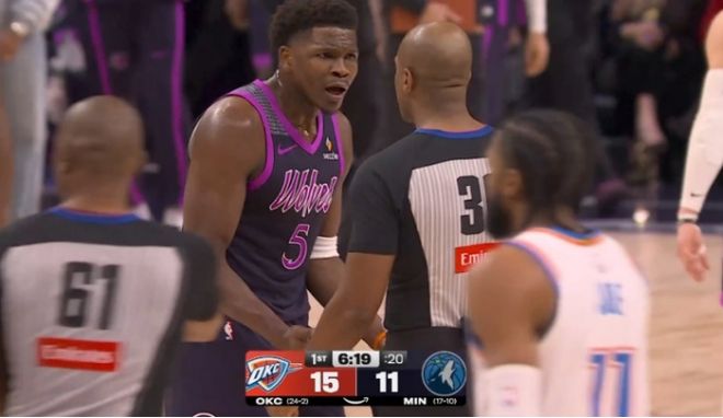 在首节比赛进行到还剩6分19秒时,爱德华兹此前反击上篮不中,兰德尔抢到篮板,但被杰伦给抢走球权。此时,森林狼主帅芬奇极为不满,他认为此前爱德华兹的上篮应该给哨,而裁判没有任何吹罚。